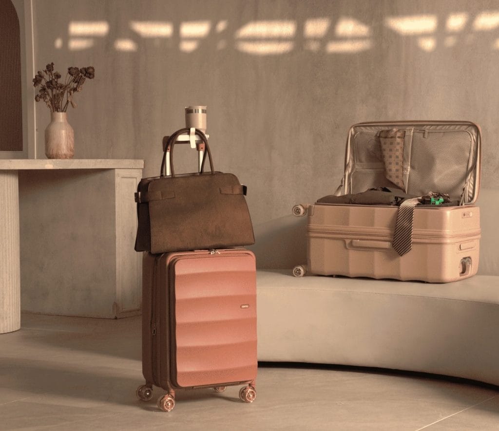 Особенно привлекает внимание запатентованная телескопическая ручка, которая служит многофункциональной: она имеет встроенный держатель для стаканов, крючок для небольших сумок и держатель для смартфона или планшета. Таким образом, на чемодане можно разместить напитки, технику или дополнительную сумку без использования отдельных держателей.
